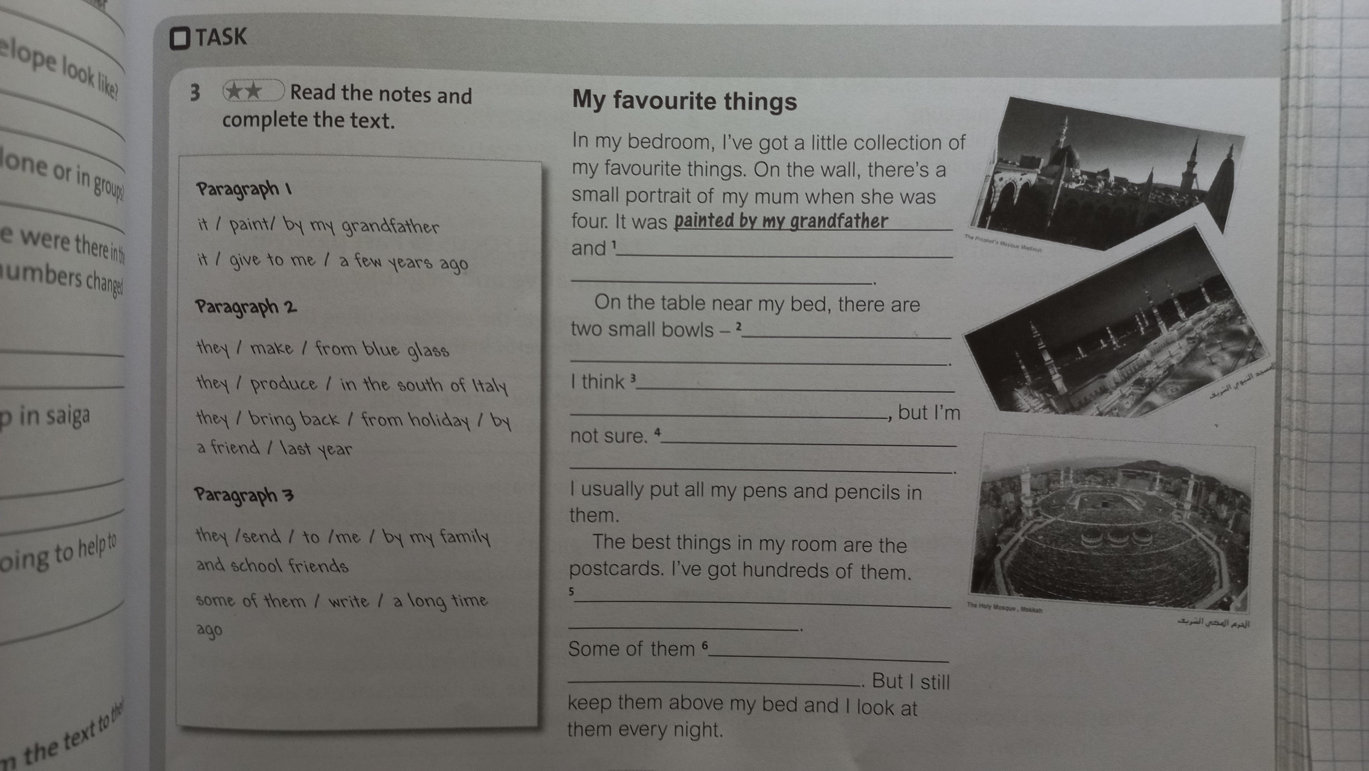 TASK My favourite things 3** Read the notes and complete the text. In my bedroom, I've got a little collection of my favourite things. On the wall, there's a small portrait of my mum when she was four. It was painted by my grandfather and' Paragraph 1 it / paint/ by my grandfather give to me I a few years ago 1 Paragraph 2 On the table near my bed, there are two small bowls - 2 I think? they I make / from blue glass they / produce I in the south of Italy they / bring back / from holiday I by but I'm 4 not sure. a friend / last year Paragraphs they send / to /me / by my family and school friends want of the writer a long time I usually put all my pens and pencils in them. The best things in my room are the postcards. I've got hundreds of them. their Some of them But I still keep them above my bed and I look at them every night.
