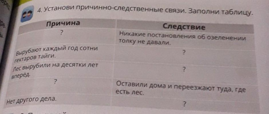 4. Установи причинно-следственные связи. Заполни таблицу. Причина ? Следствие Никакие постановления об озеленении толку не давали. Вырубают каждый год сотни ? гектаров тайги. Пес вырубили на десятки лет ? sneред. ? Оставили дома и переезжают туда, где есть лес. ? Нет другого дела.