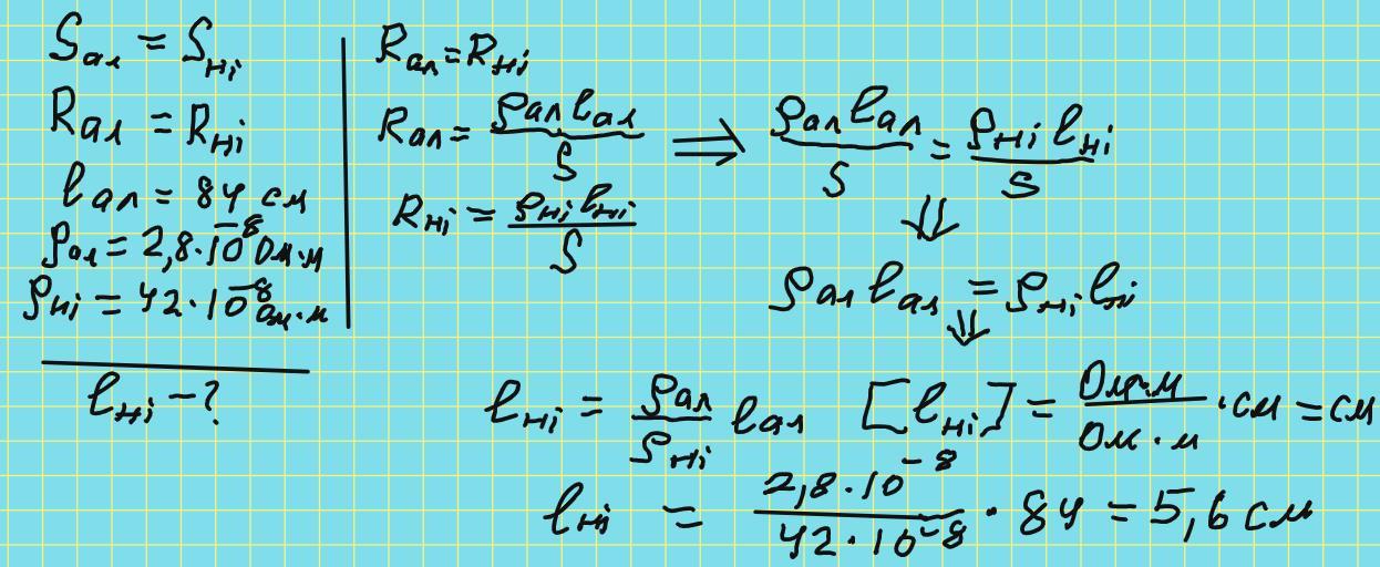 Никелиновая и алюминиевая проволоки имеют одинаковое сечение. Какую длину должен иметь никелиновая проволока, чтобы ее сопротивление было таким же, как и сопротивление алюминиевой проволоки длиной 84 см?