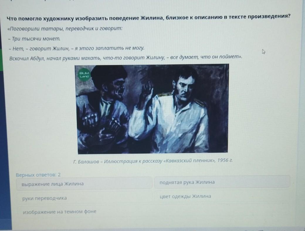 Что помогло художнику изобразить поведение Жилина, близкое кописанию в тексте произведения? «Поговорили татары, переводчики говорит: - Три тысячи монет. — Нет, – говорит Жилин, – я этого заплатить не могу. Вскочил Абдул, начал руками махать, что-то говорит Жилину, – все думает, что он поймет». BRM LAro Г. Балашов - Иллюстрация к рассказу «Кавказский пленник», 1956 г. Верных ответов: 2 выражение лица Жилина поднятая рука Жилина руки переводчика Цвет одежды Жилина изображение на темном фоне.