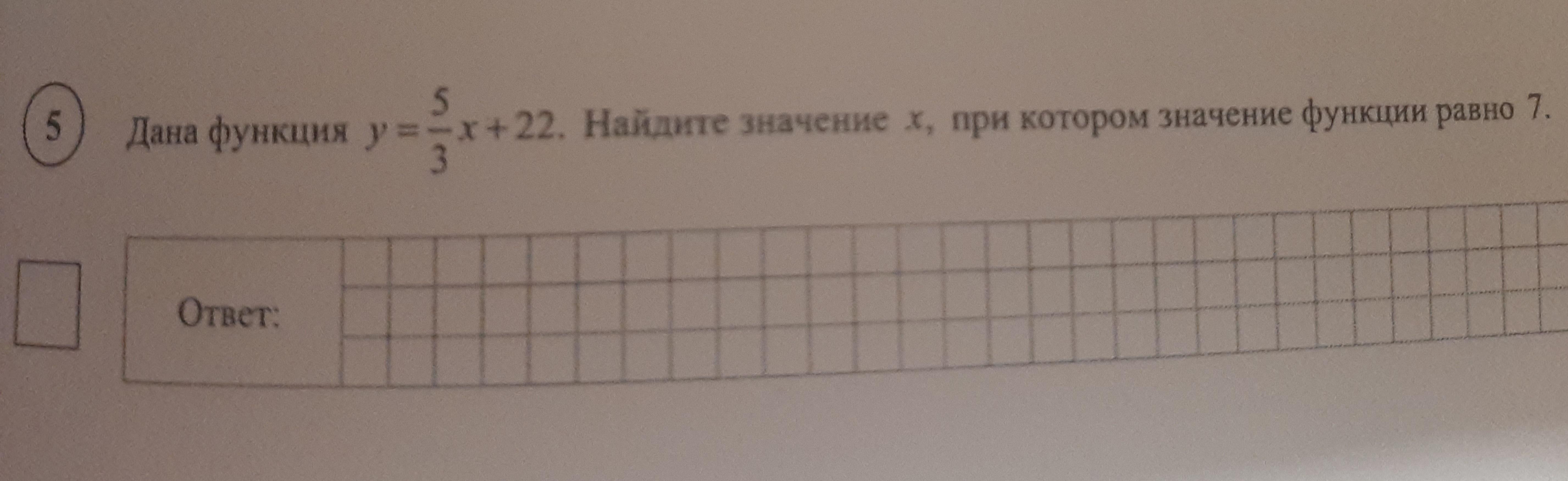 Жана функция y=5/3x+22. Найдите значение х, при котором значение функции равно 7.