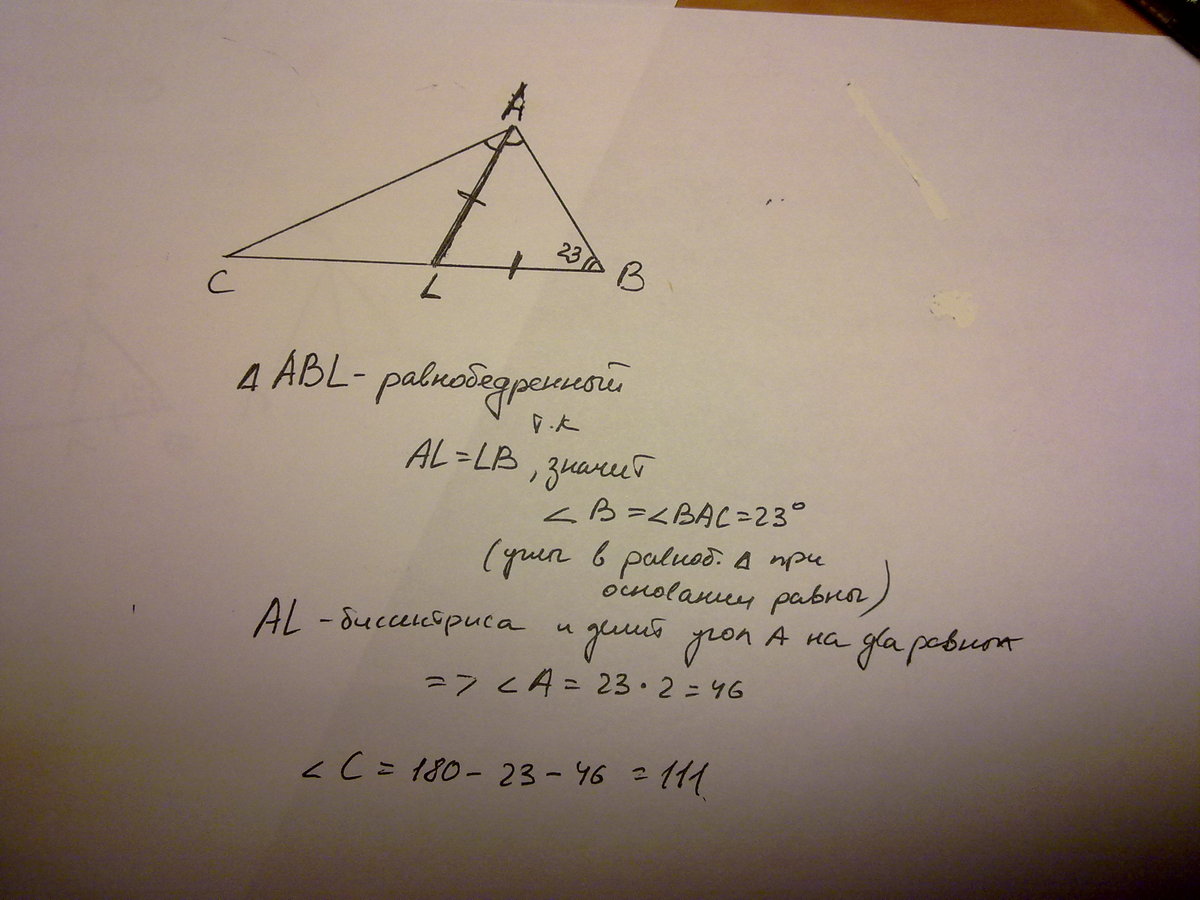 В треугольнике АВС ПРОВЕДЕНА БИССЕКТРИСА AL. AL= LB, а угол В равен 23 градуса. Найдите угол С. Ответ дайте в градусах.