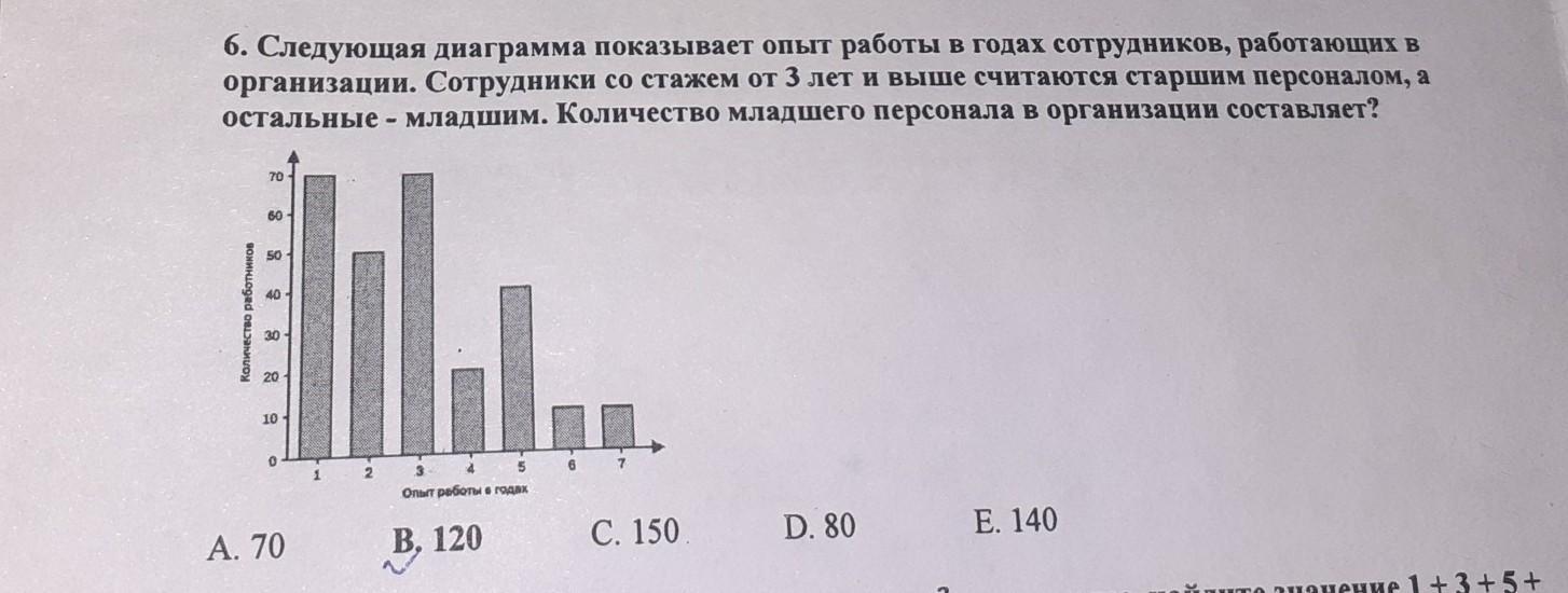Всего работников имеющих опыт 1 и 2 года = 70 + 50 = 120 работников