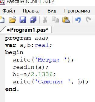 программа ABC pascal:с клавиатуры вводятся x метров перевести метры в сажени, если 1 сажень=2.1336 м