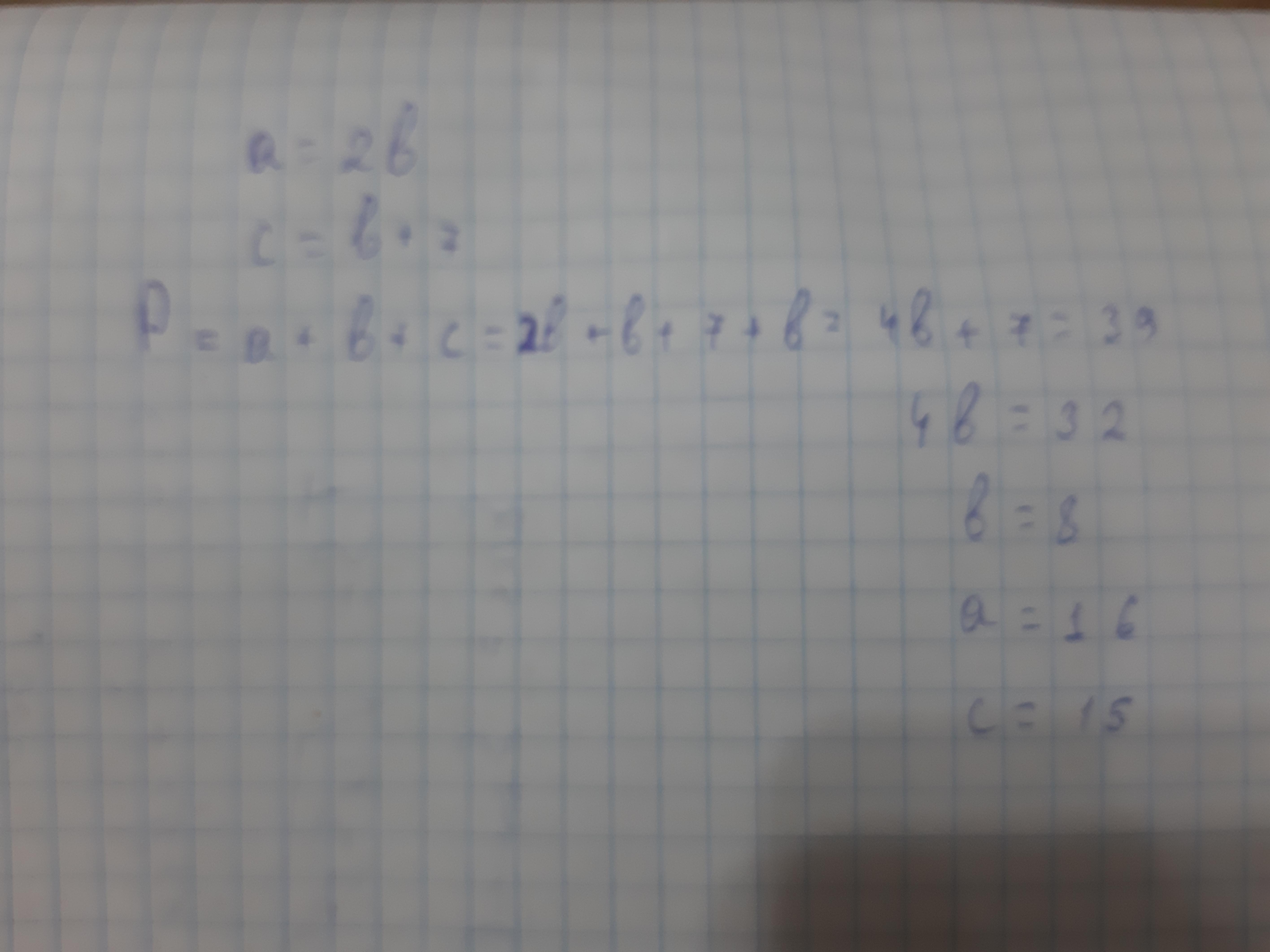 Одна из сторон треугольника в 2 раза меньше второй и на 7 см меньше третьей. Найдите стороны треугольника, если его периметр равен 39 см. Помогите