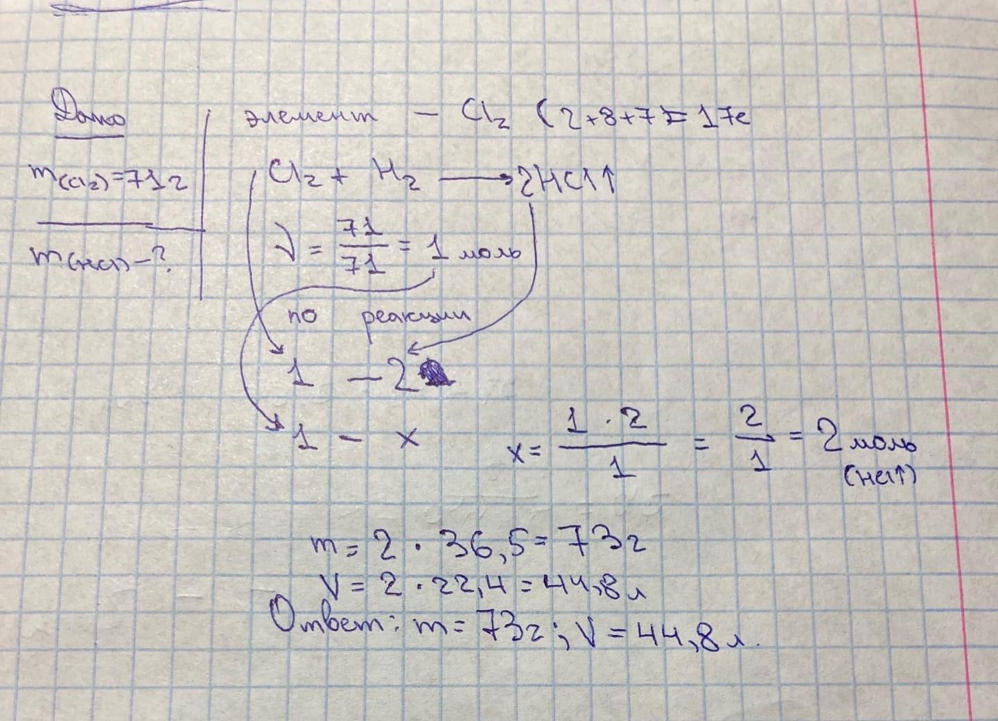 Элемент строение 2е 8е 7е массой 71г прореагировал с водородом.найдите массу образовавшегося газа.