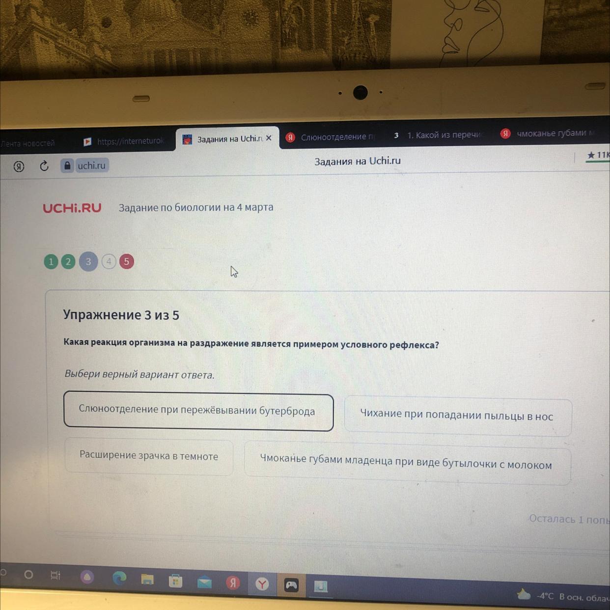 Какая реакция организма на раздражение является примером условного рефлекса? (Выберите один верный вариант ответа)