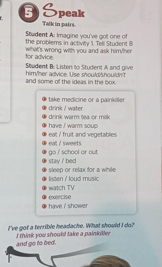 Student A: I've got stomach pain. What should I do?(У меня болит живот/боль в животе. Что мне сделать?)