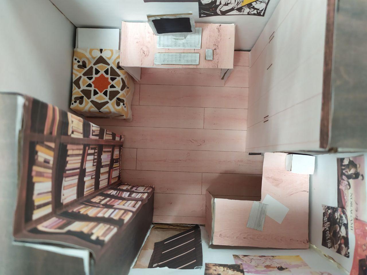 Как видно, сделано все из бумаги и картона. Это комната, в котором находится книжный шкаф, парты и на парте бумаги, обычный шкаф для одежд, компьютер, кровать, плокаты. пол и парты розового цвета. при входе в комнату на первом плане стоит стол где на столе стоит компьютер. С лева стоят книжный шкаф и кровать. с права стоят парта, плокаты и шкаф. И комната не много маленький. Но как по мне он очень прикольный❤️