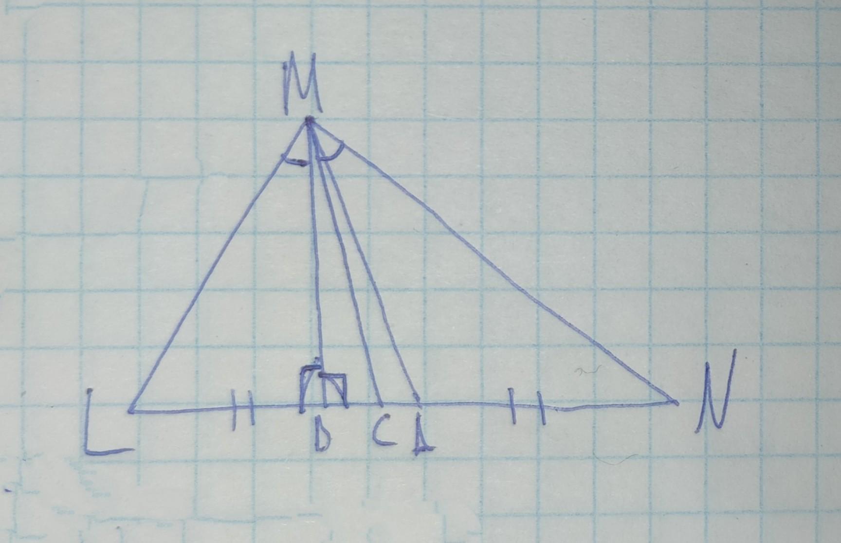 1. Побудуйте нерівнобедрений трикутник LMN і проведіть медіану МА, висоту MB та бісектрису МС. Укажіть пари рівних відрізків, рівних кутів. Який відрізок зображує відстань від точки M до прямої LN?