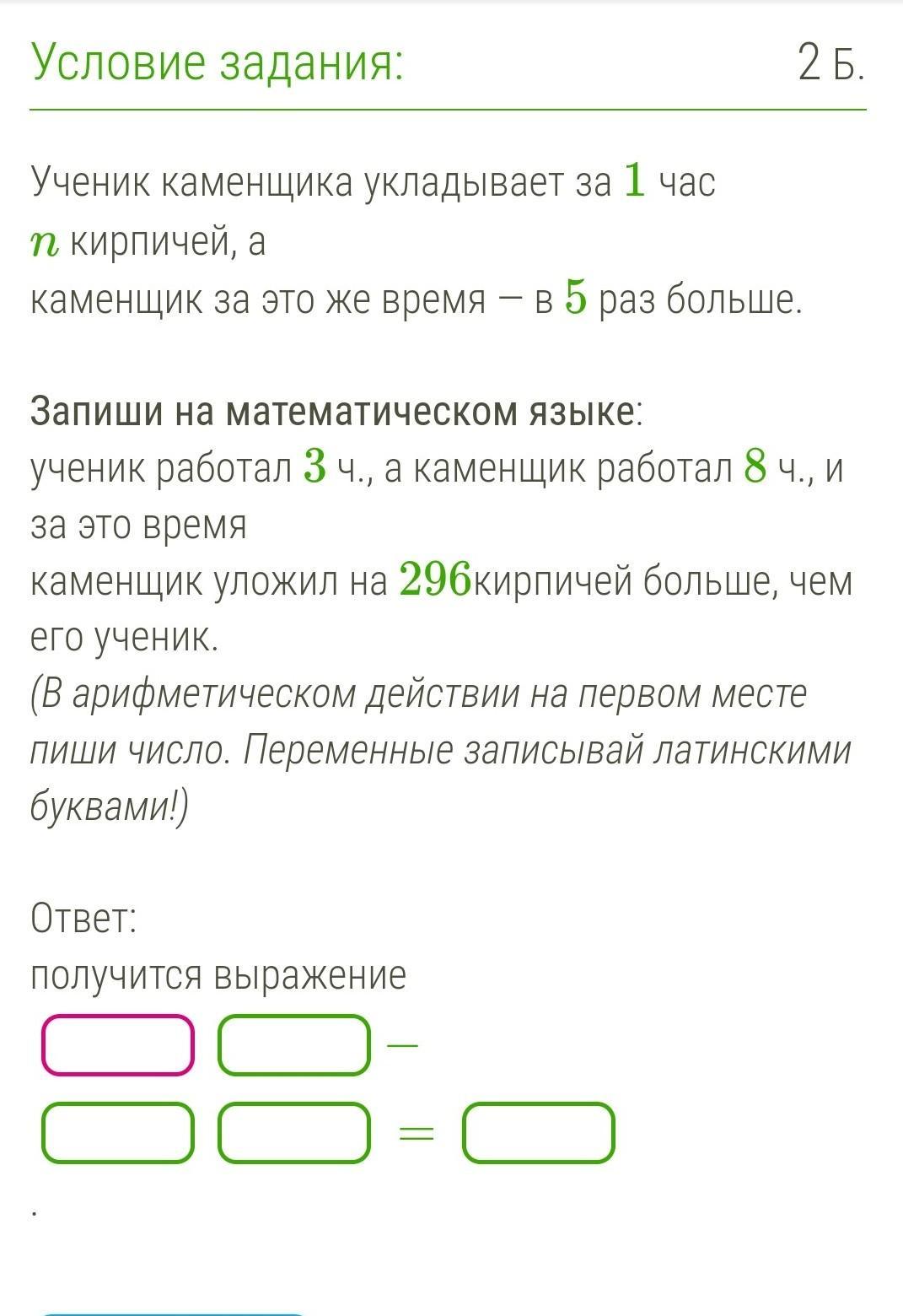 б) ученик работал 3ч, а каменщик-6ч, и за это время каменшик уложил на 540 кирпиче больше, чем его ученик; 5n*6-n*3=540