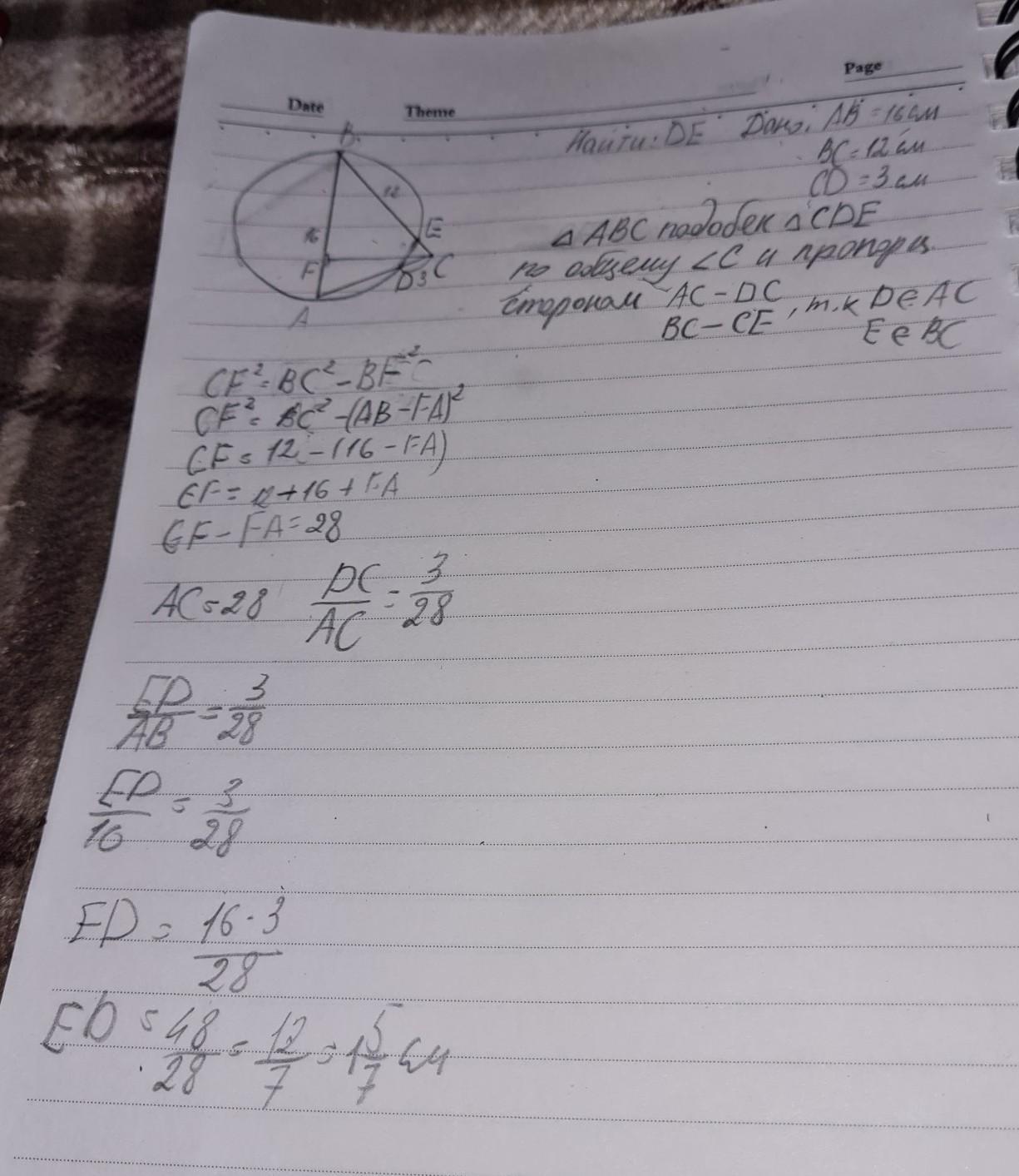 Через вершины А и В треугольника ABC проведен круг, пересекающий стороны AC и ВС в точках D i E соответственно. Известно, что AB = 16 см, ВС = 12 см, CD = 3 см. Найдите отрезок DE.