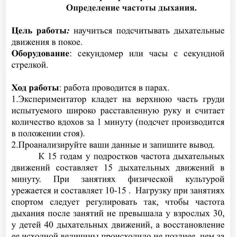 Вывод: в ходе работы я научился подсчитывать дыхательные движения в покое.