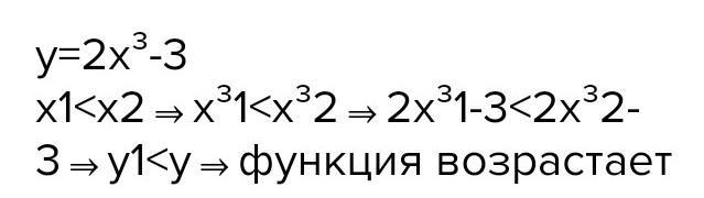 функция получена из ф-ции у=х^3 путем умножения на 2, т. е более прижата к оси ординат, и вычитания 3, т. е параллельный перенос на 3 клетки вниз по оси ординат. И так же, как и у=х^3, она монотонна от - беск до + беск, везде возрастает. Ура!