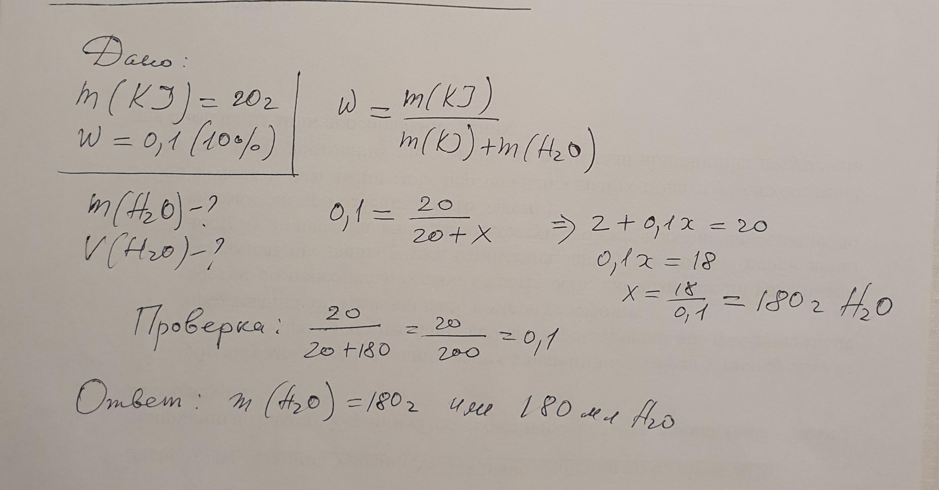 Необходимо рассчитать объем растворителя (дист. воды) для приготовления 10% раствора йодистого калия при навеске 20 г.