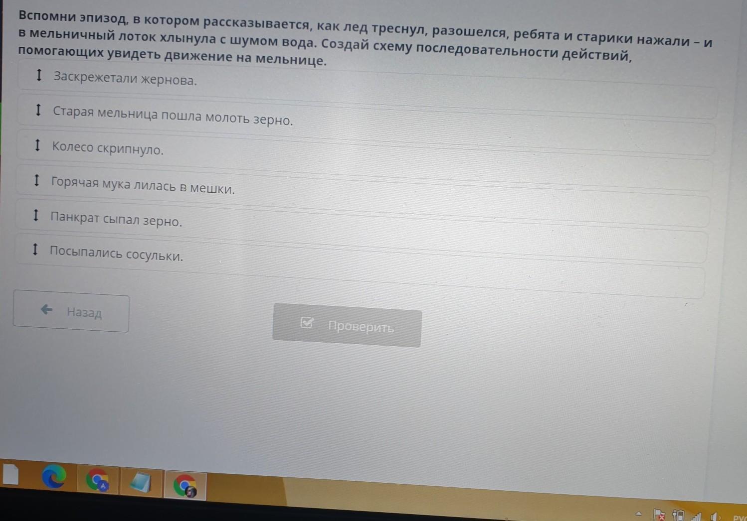 Вспомни эпизод, в котором рассказывается, как лед треснул, разошелся, ребята и старики нажали - и в мельничный лоток хлынула с шумом вода. Создай схему последовательности действий, помогающих увидеть движение на мельнице. 1 Заскрежетали жернова. 1 Старая мельница пошла молоть зерно. 1 Колесо скрипнуло. 1 Горячая мука лилась в мешки. 1 Панкрат сыпал зерно. 1 Посыпались сосульки.