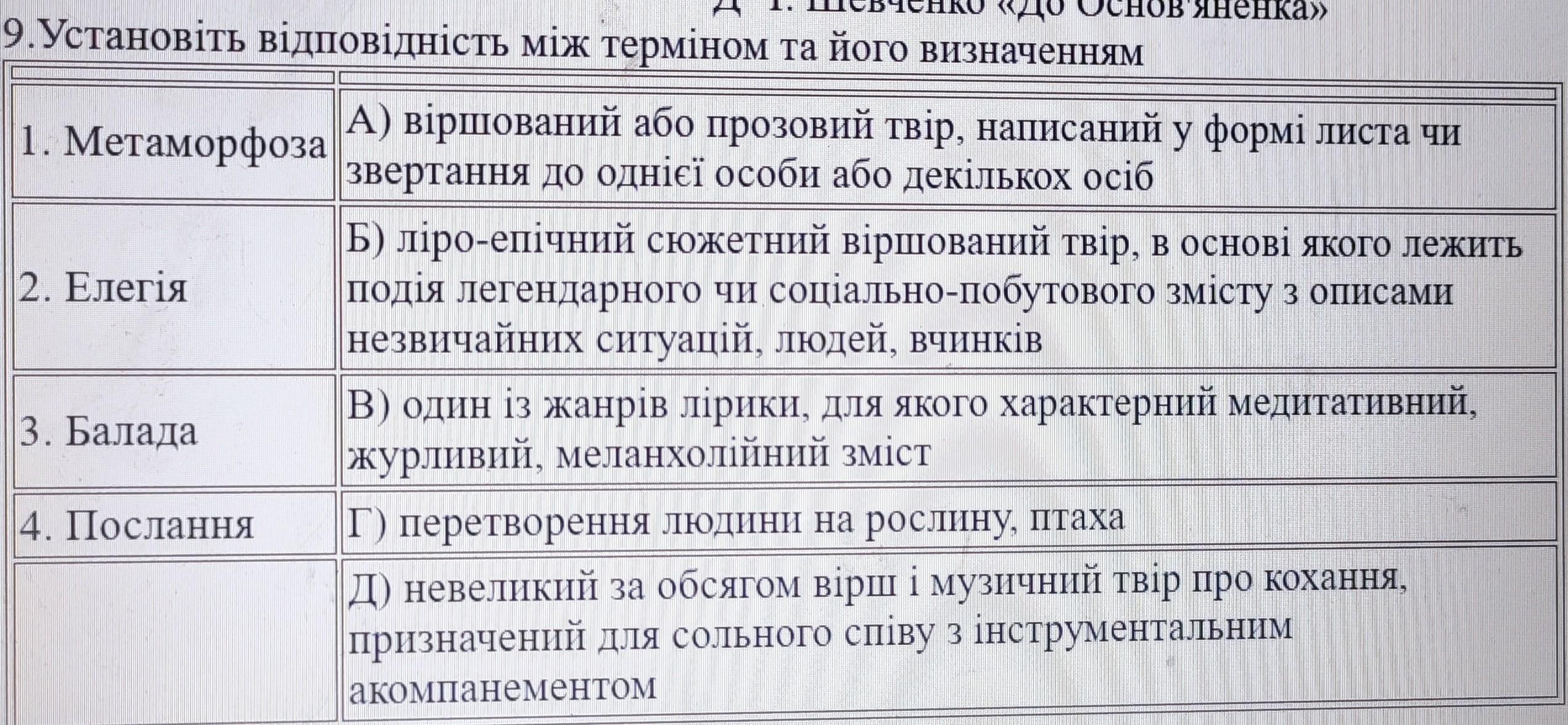 3. Балада — Б) ліро-епічний сюжетний віршований твір, в основі якого лежить подія легендарного чи соціального-побутового змісту з описами незвичайних ситуацій, людей, вчинків;