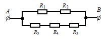 Сопротивление каждого резистора в цепи, показанной на рисунке, равно 100 Ом. Участок подключён к источнику постоянного напряжения выводами A и B. Напряжение на резисторе R4 равно 12 В. Напряжение между выводами схемы UAB равно