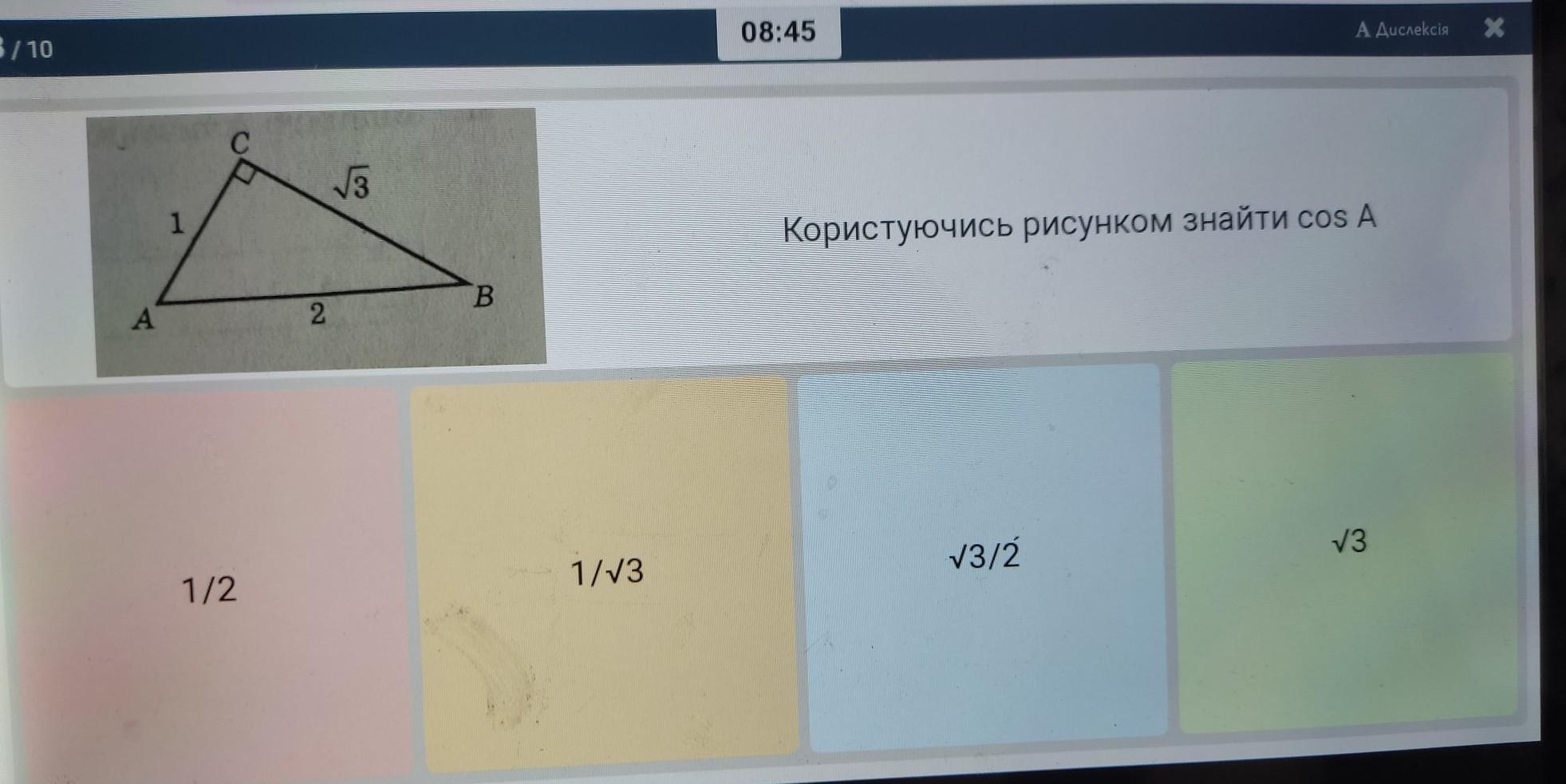 Сосинус этоотношение противолежащего катета к гипотенузе. Против угла А лежит катет,равный √3, агипотенузаравна 2