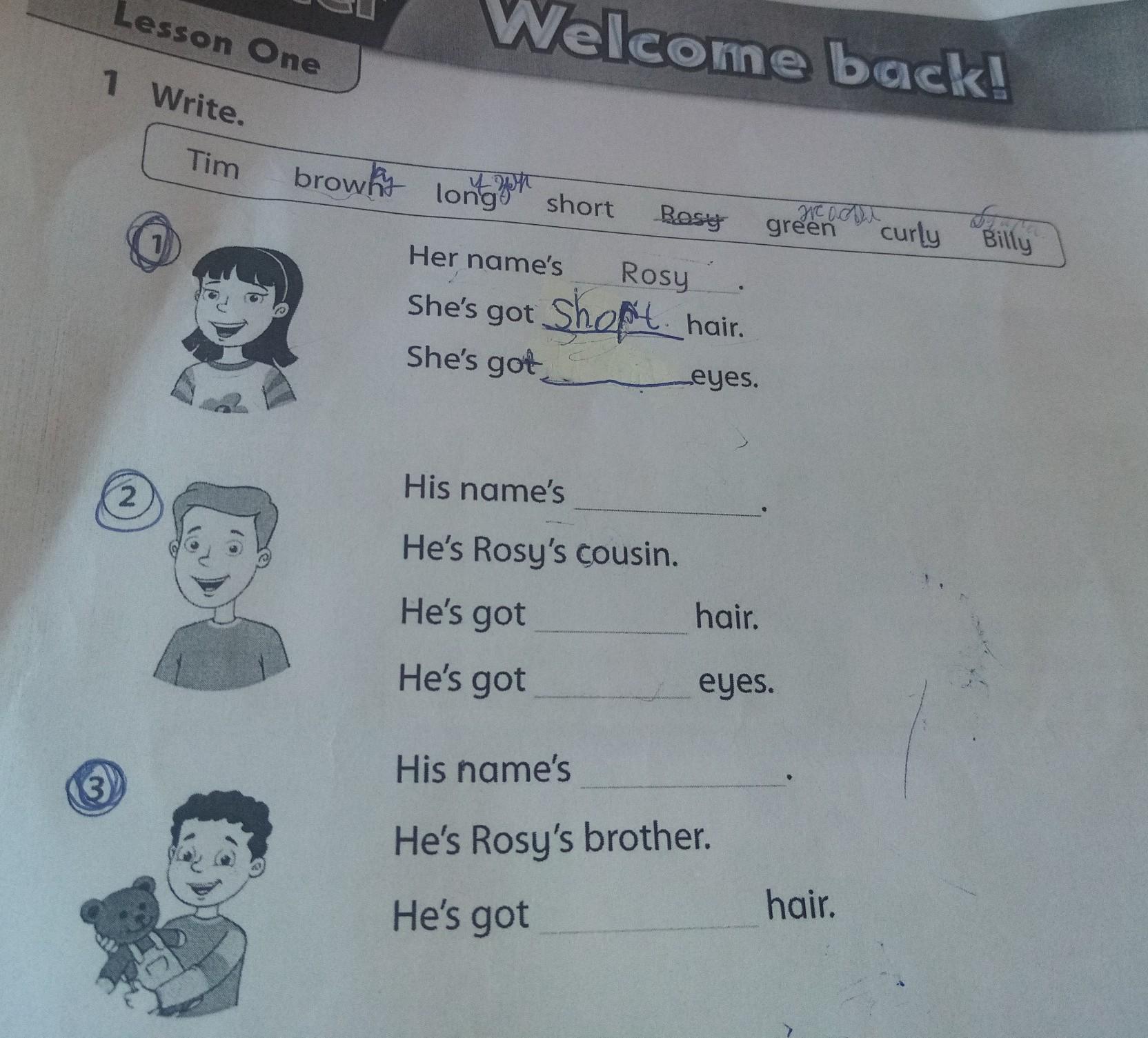 son One 1 Write. Sara Billy NiCdut curly Tim browht long short Best green long you Rosy Her name's She's got shopt hair. She's got Leyes. His name's 2 He's Rosy's cousin. hair. of He's got He's got eyes. His name's w He's Rosy's brother. hair. He's got