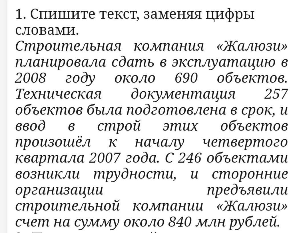 Строительная компания "Жалюзи" планировала сдать в эксплуатацию в две тысячи восьмом году около шестисот девяноста объектов. Техническая документация двухсот пятидесяти семи объектов была подготовлена в срок, и ввод в строй этих объектов произошёл к началу четвёртого квартала две тысячи седьмого года. С двумястами сорока шестью объектами возникли трудности, и сторонние организации предъявили строительной компании "Жалюзи" счёт на сумму около восьмисот сорока миллионов рублей.