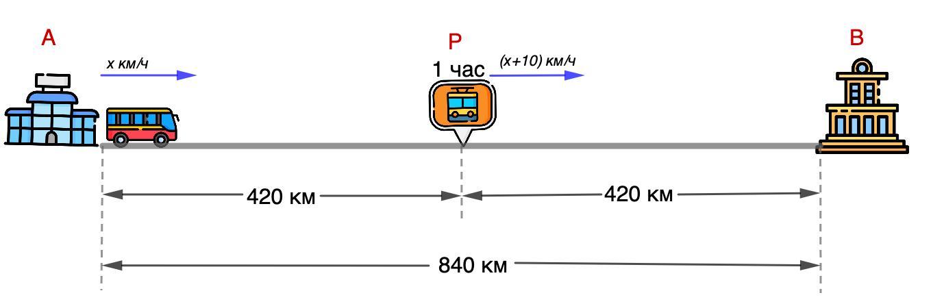 Из пункта А в пункт В, расстояние между которыми 840 км, выехал автобус.
