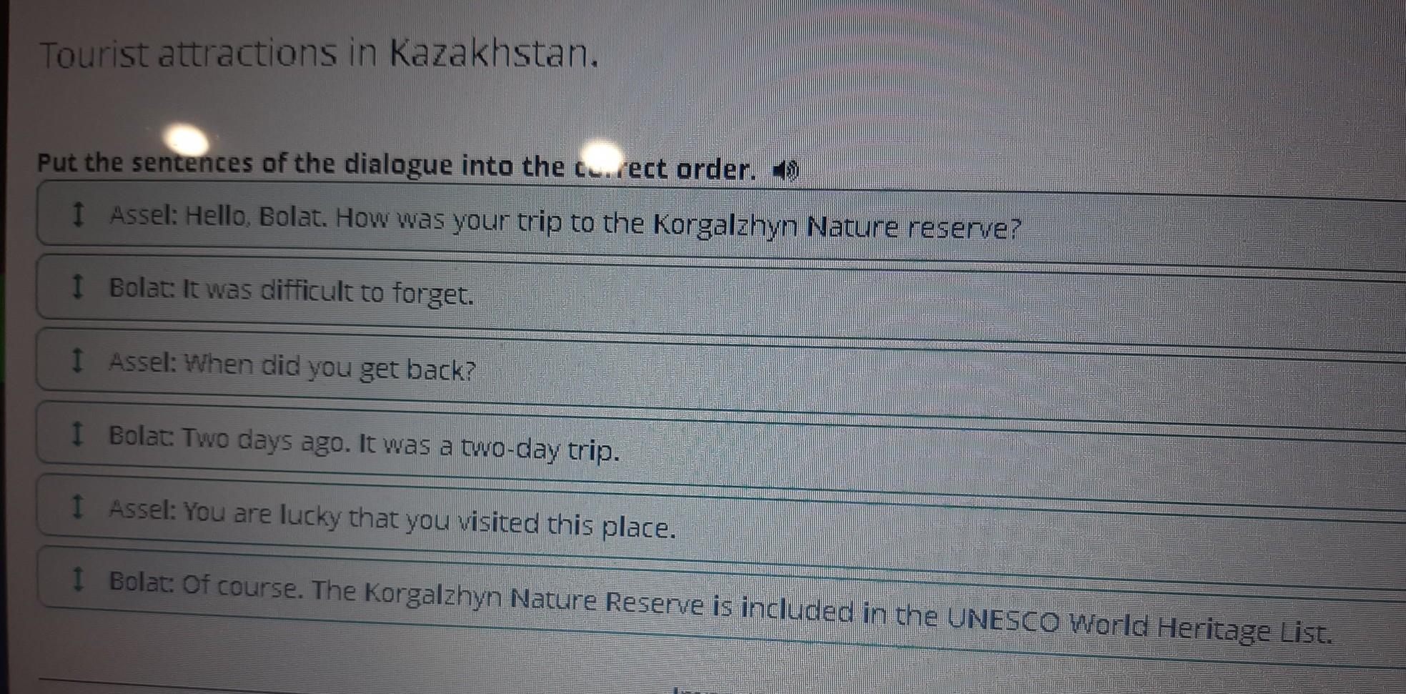 Assel: Hello, Bolat. How was your trip to the Korgalzhyn Nature reserve?