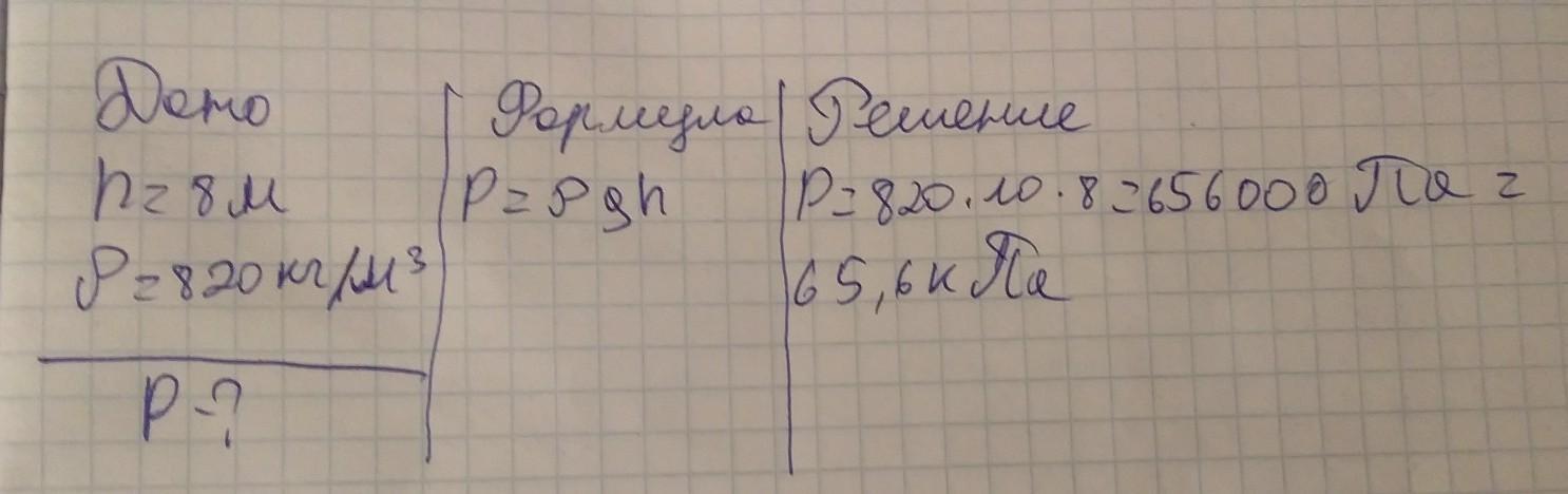 Р=ρgh=820*10*8=65600Па=65,6кПа
