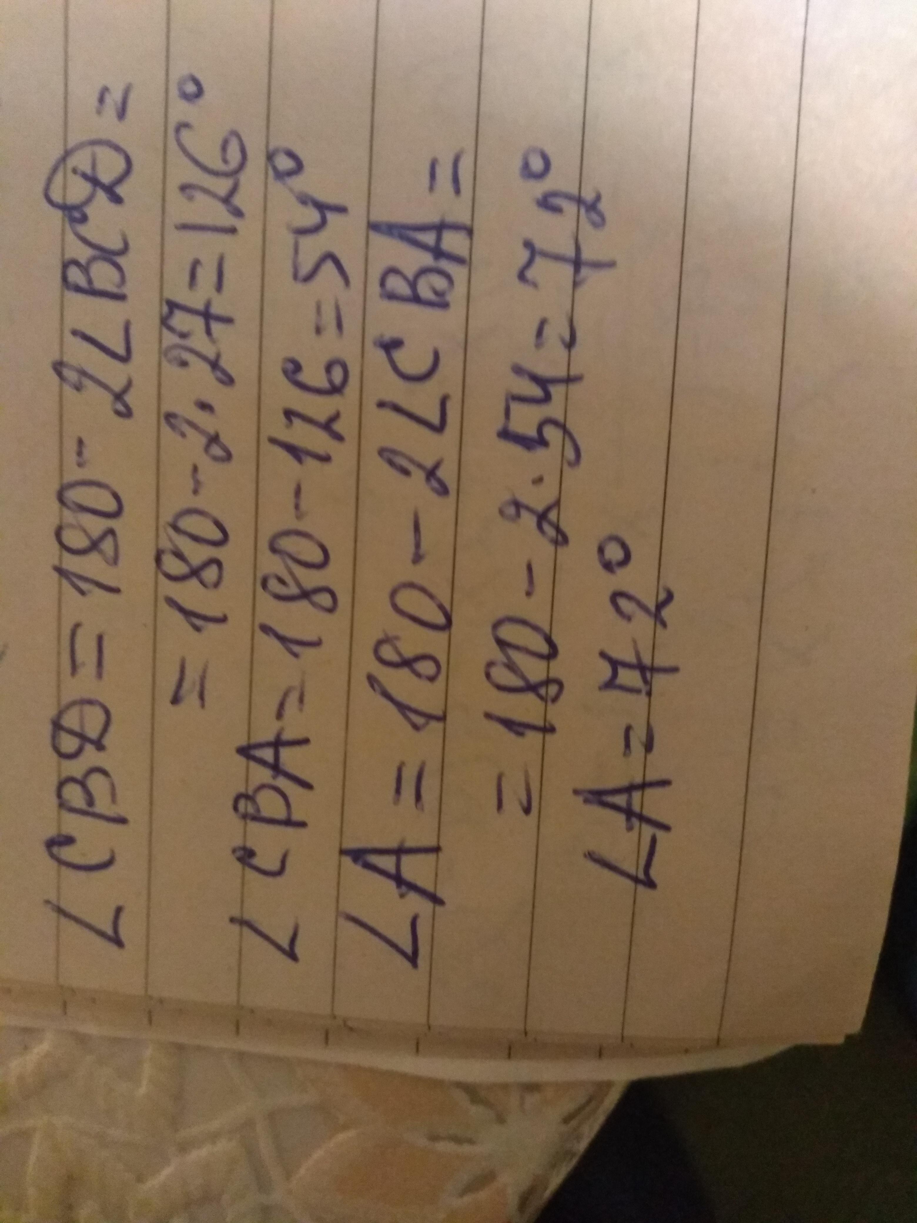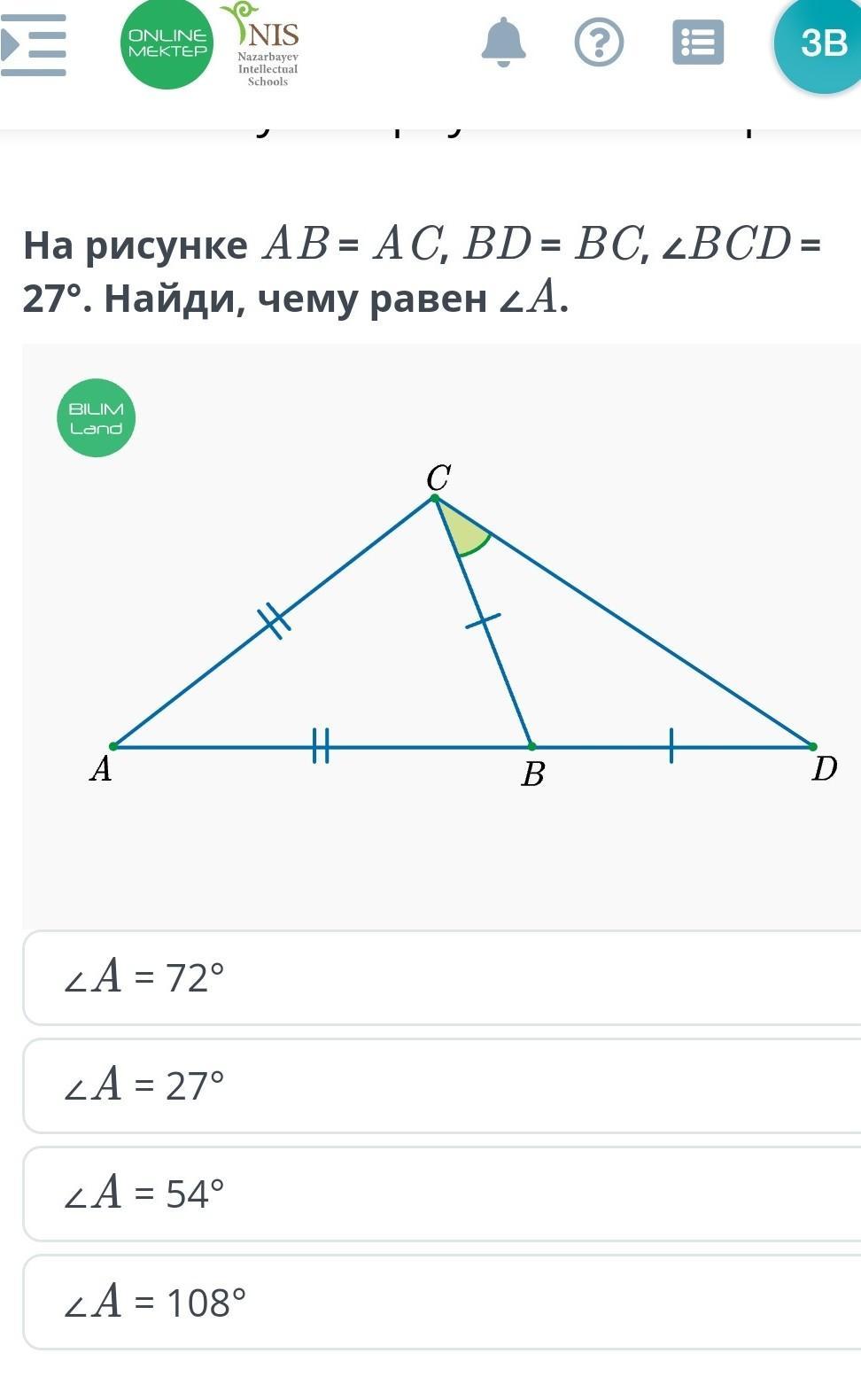Сумма углов треугольника. Внешний угол треугольника. Урок 3 На рисунке АВ=АС,ВD=BC,уголВСD= 27°. Найди чему равен угол А ∠A = 72° ∠A = 54° ∠A = 108° ∠A = 27°