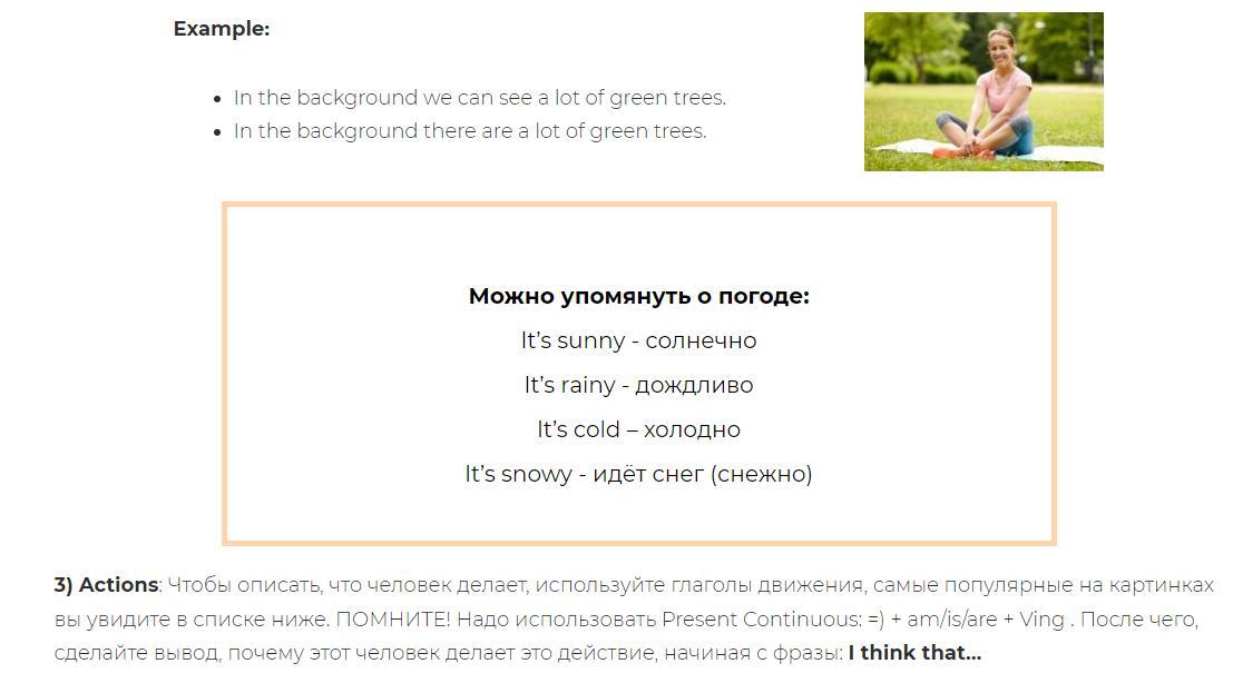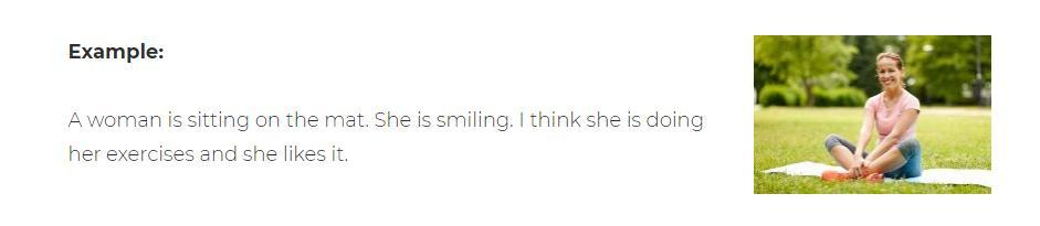 In the foreground we can see a girl. She is sitting on a mat for sports. The girl smiles. In the background there are a lot of green trees. She is in a park. It's sunny outside. I think she's sitting on the mat because she wants to do yoga.