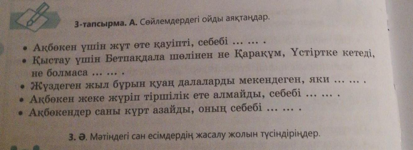 Пожалуйста даю 80 баллов 3-тапсырма. А. Сөйлемдердегі ойды аяқтаңдар. . .... .. • Ақбөкен үшін жұт өте қауіпті, себебі .. • Қыстау үшін Бетпақдала шөлінен не Қарақұм, Үстіртке кетеді, не болмаса Жүздеген жыл бұрын қуаң далаларды мекендеген, яки ... • Ақбөкен жеке жүріп тіршілік ете алмайды, себебі • Ақбөкендер саны күрт азайды, оның себебі ... ...