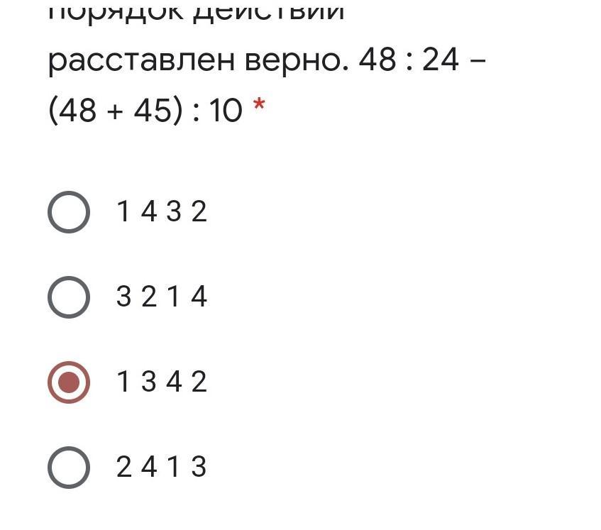 4.Укажи выражение, где порядок действий расставлен верно. 48 : 24 − (48 + 45) : 10 * 1 балл 1 4 3 2 3 2 1 4 1 3 4 2 2 4 1 3