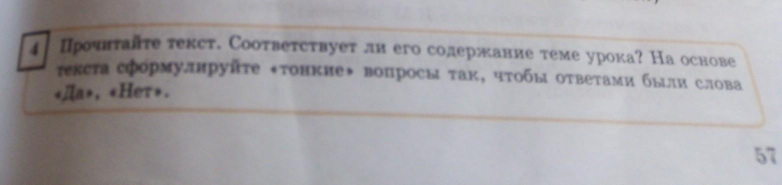 4 Прочитайте текст. Соответствует ли его содержание теме урока? На основе текста сформулируйте «тонкие» вопросы так, чтобы ответами были слова «Да», «Нет». 57