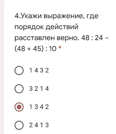 4.Укажи выражение, где порядок действий расставлен верно. 48 : 24 − (48 + 45) : 10 * 1 балл 1 4 3 2 3 2 1 4 1 3 4 2 2 4 1 3 и. там где красным отмечено это не обращайте внимание это нажалось просто