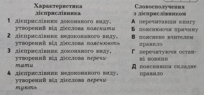 установіть відповідність між дієприслівником, ужитим у словосполучені, та його характеристикою