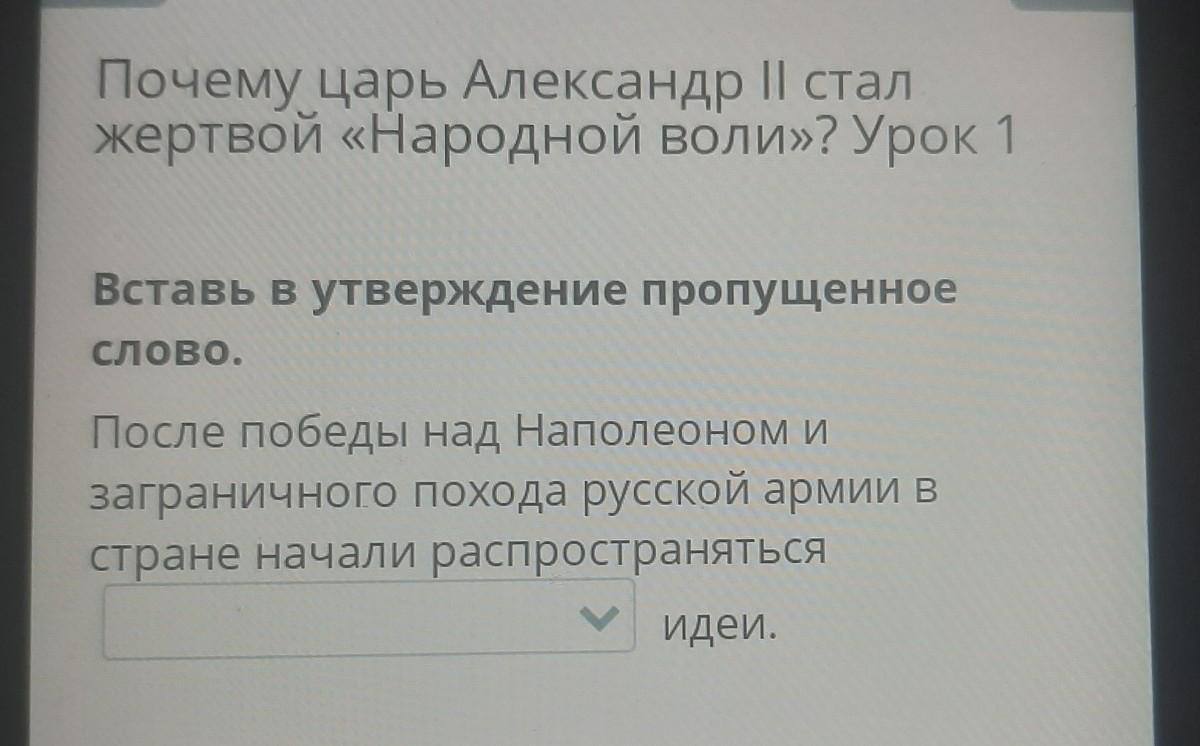 Почему царь Александр II стал жертвой «Народной воли»? Урок 1 Вставь в утверждение пропущенное слово. После победы над Наполеономи заграничного похода русской армии в стране начали распространяться a BE а идей.помогите срочно