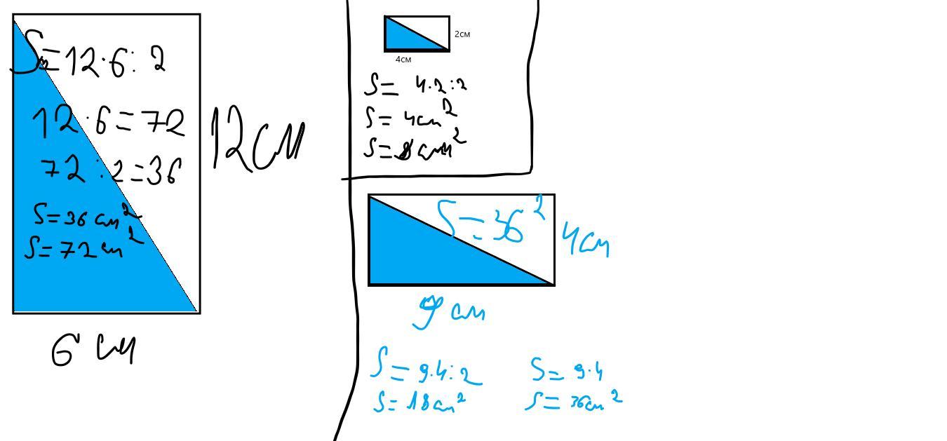 3) площадь прямоугольника - 36см, площадь триугольника - 18см