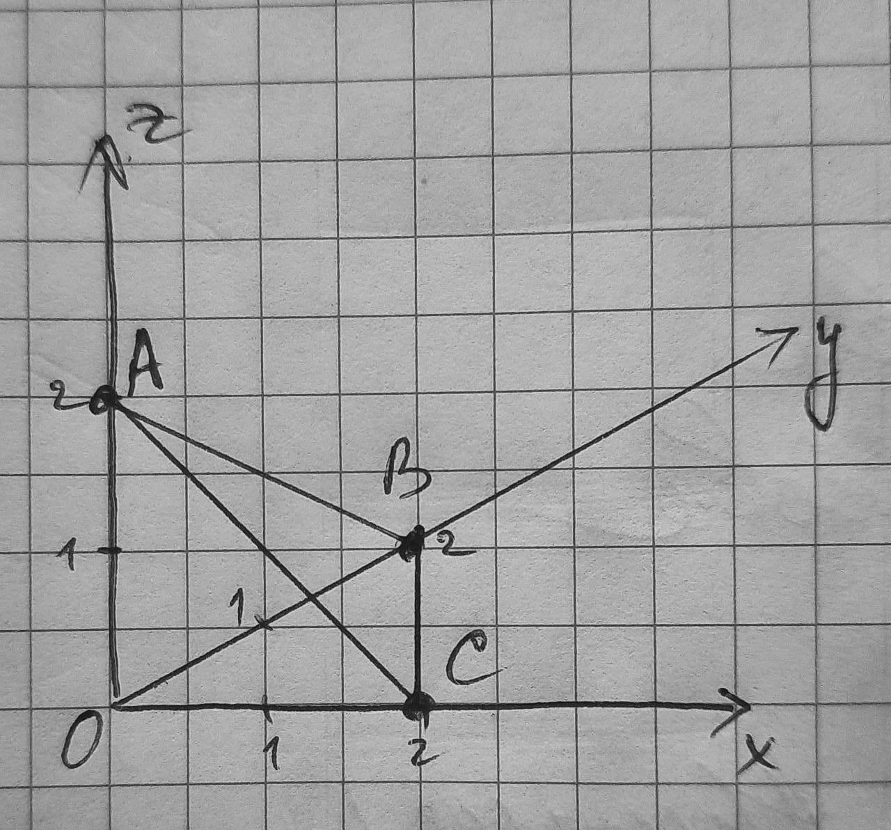 Здесь все ребра, прилебащие к вершине О будут иметь одинаковую длину, равную двум. Также знаем, что углы между осями координат составляют 90°. Соответственно имеем равенство треугольников