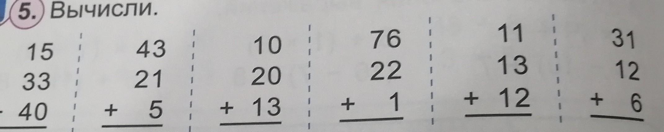 5.) Вычисли. 15 33 + 40 31 43 21 + 5 1 10 20 + 13 76 22 1 + 1 11 13 + 12 12 + 6 1 +
