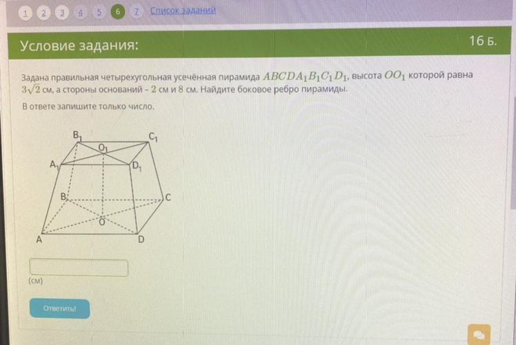 3N2 см, а стороны оснований – 2 см и 8 см. Найдите боковое ребро пирамиды.