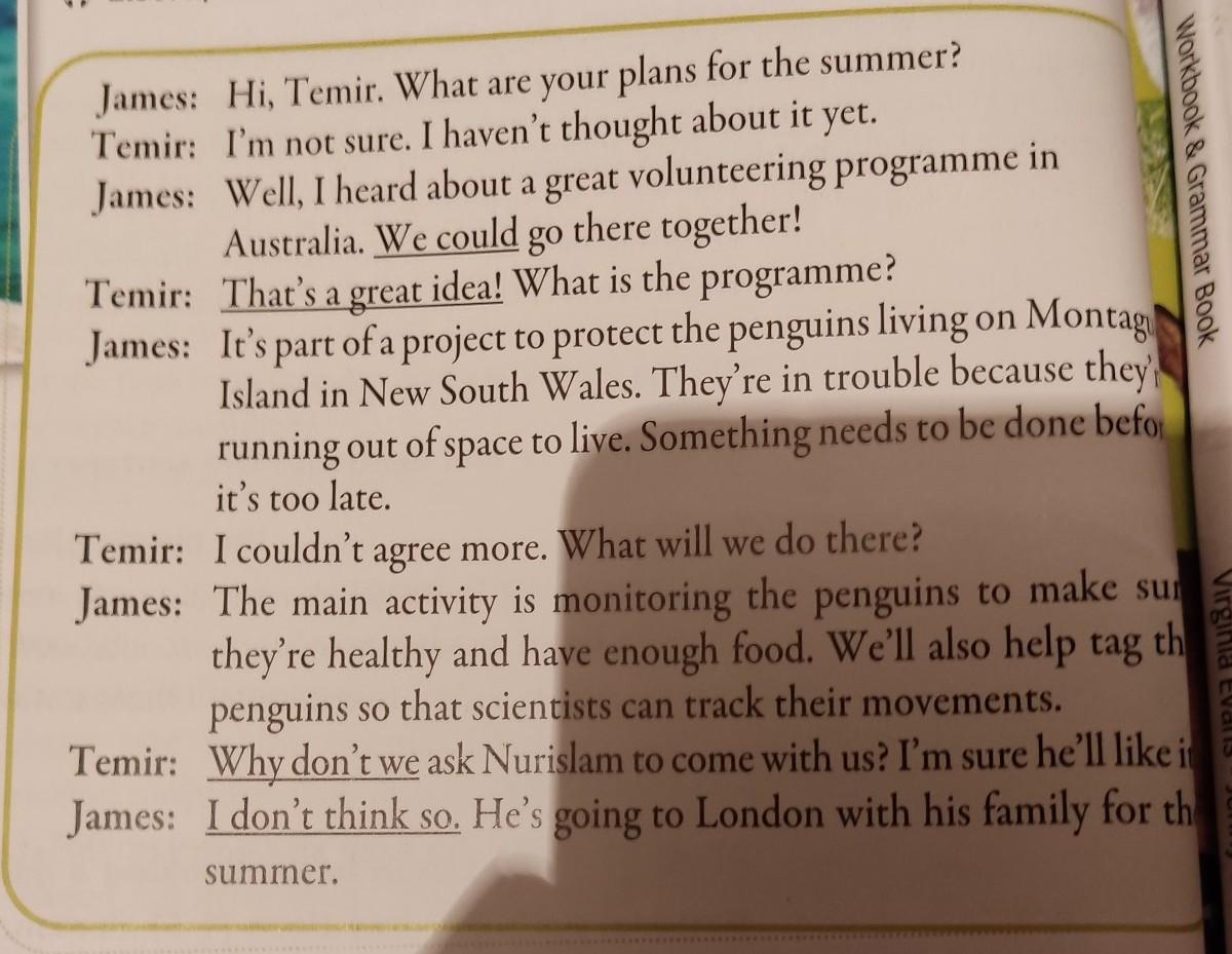 Listen to and read the dialogue again. Take roles and read it aloud. How will James and Temir help protect the penguins?