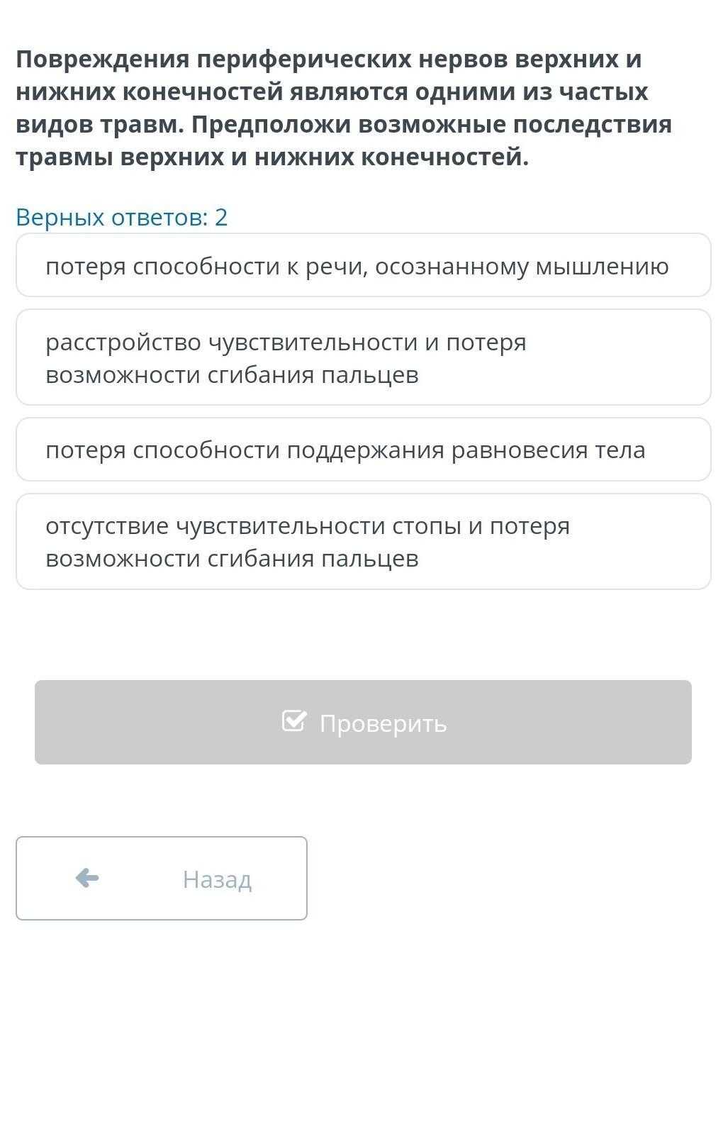 Верных ответов: 2 потеря способности к речи, осознанному мышлению расстройство чувствительности и потеря возможности сгибания пальцев потеря способности поддержания равновесия тела отсутствие чувствительности стопы и потеря возможности сгибания пальцев