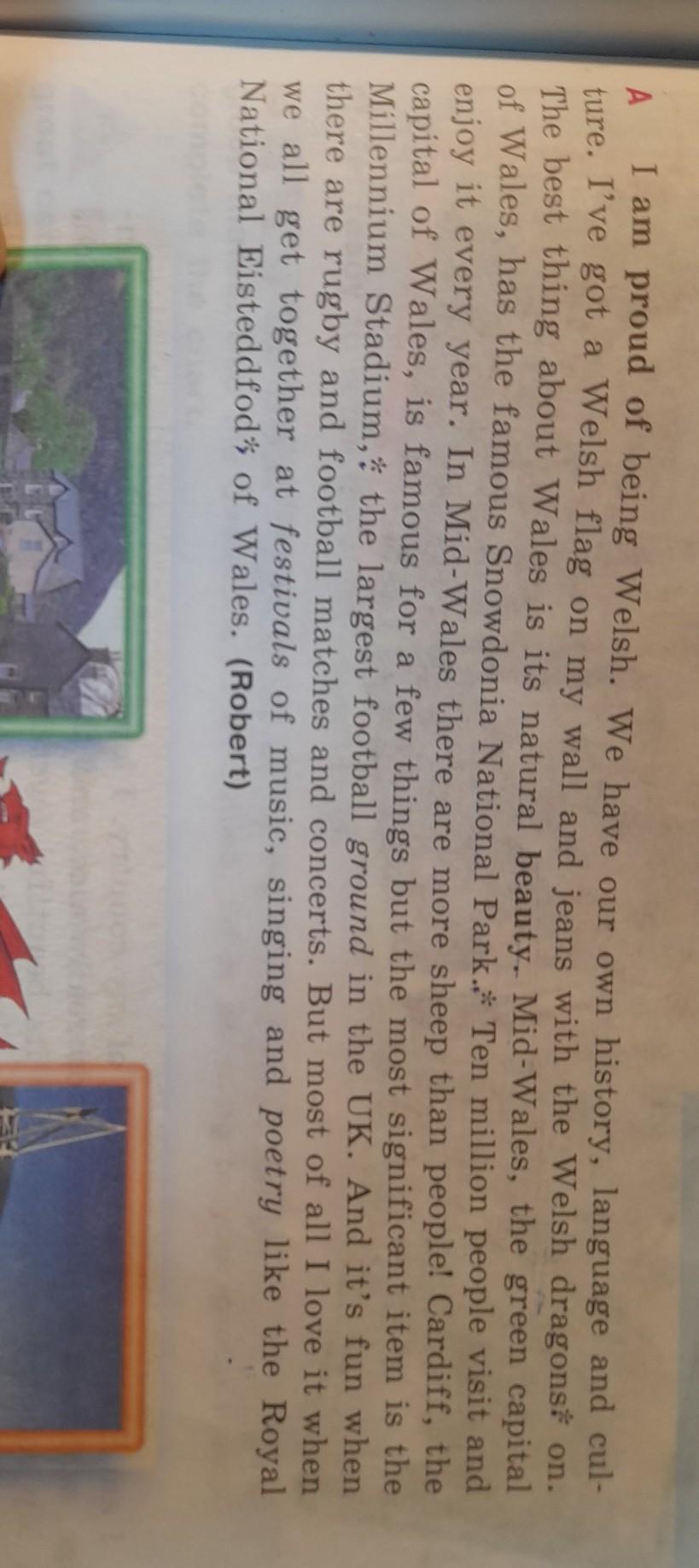 Зе бест зинг абаут Уэлс ис итс нэтшрал бьюти. Мид Уэлс , зе грин кэпитал оф Уэлс, хэс зе фэймус Сноудония Нэйшнал Парк. Тэн миллион пипл визит энд энджой ит эвери йе. Ин Мид Уэлс зера мо шип зэн пипл. Кардиф , зэ капитал оф Уэлс , ис фэймус фо э фью зингс бат зе мост сайнификант айтем ис зе Миллениюм Стэдиюм, зе ладжест футбал граунд ин зе Юкэй. Энд итс фан уен зера рагби энд футбал матчэс энд концертс. Бат мост оф ол ай лав ит уен уи ол гет тугезе , ат фестивалс оф мьюзик, сингинг энд поетри лайк зе Роял Нэйшнал Эйстэдфад оф Уэлс…. (ух, наконец-то закончила)