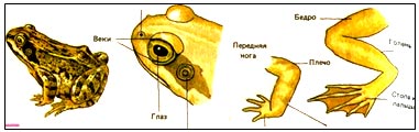 У лягушки хорошо развиты парные конечности - передние и задние ноги. Каждая конечность состоит из трех главных отделов. В передней ноге различают: плечо, предплечье и кисть. У лягушки кисть заканчивается четырьмя пальцами (пятый палец у неё недоразвит) . В задней конечности эти отделы называются бедром, голенью и стопой. Стопа заканчивается пятью пальцами, которые у лягушки соединены плавательной перепонкой. Отделы конечностей подвижно сочленены между собой при помощи суставов. Задние ноги значительно длиннее и сильнее передних, они играют главную роль при движении. Сидящая лягушка опирается на слегка согнутые передние конечности, задние при этом сложены и находятся по бокам тела. Быстро распрямляя их, лягушка совершает прыжок. Передние ноги при этом предохраняют животное от удара о землю. Плавает лягушка подтягивая и выпрямляя задние конечности, а передние при этом прижимает к телу.