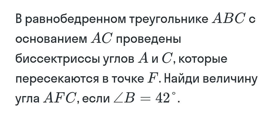 Дано: ΔАВС, АК, СЕ - биссектрисы, ∠В=42°. ∠АFС - ?