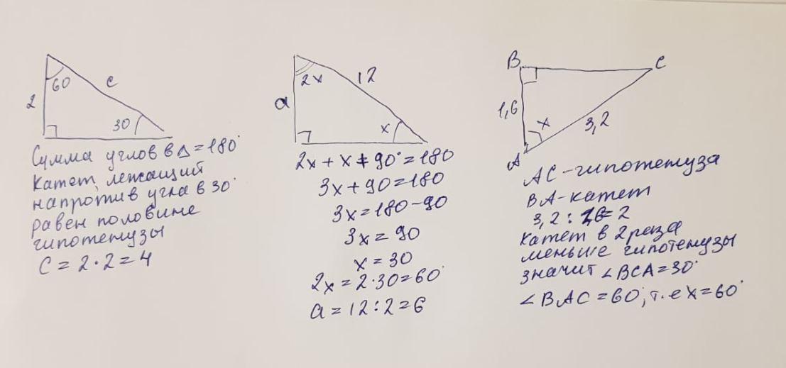 И наоборот, если катет равен половине гипотенузы, значит напротив этого катета лежит угол в 30° - для последнего.