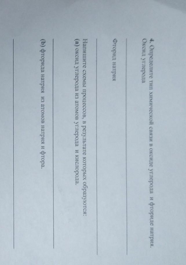 4. Определите тип химической связи в оксиде углерода и фториде натрия. Оксид углерода Фторид натрия Напишите схемы процессов, в результате которых образуются: