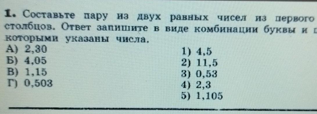 1. Составьте пару из двух равных чисел из первого и второго столбцов. Ответ запишите в виде комбинации буквы и цифры, под Колорыми указаны числа. А) 2,30 1) 4,5 Б) 4,05 2) 11.5 В) 1,15 3) 0,53 Г) 0,503 4) 2,3 5) 1,105