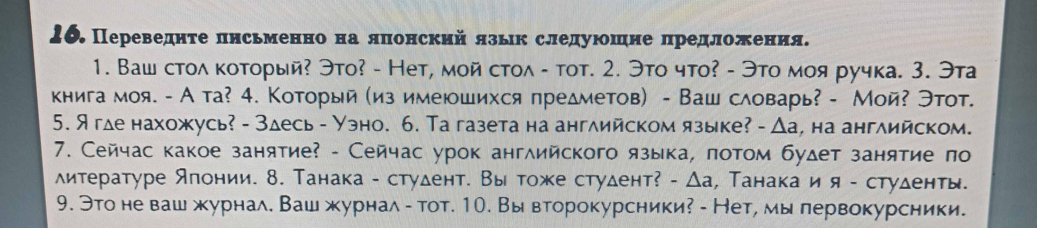 クソ愚かまたは性交私はこの性交を翻訳する方法を知っています私はこのたわごとを学んでいます日本語に次の文。 あなたのテーブルはどれですか? これ?-いいえ、私のテーブルはそれです。 2.これは何ですか?-これは私のペンです。 3.この本は私のものです。 -そしてそれ? 4.あなたの辞書は(利用可能なアイテムの)どれですか?-私のものですか? これ。 5.私はどこにいますか?-ここ-それは面白いです、6。その新聞は英語ですか? -はい、英語で。 7.さて、レッスンは何ですか? 日本文学。 8.田中は学生です。 あなたも学生ですか?-はい、田中と私は学生です。 9.これはあなたの雑誌ではなく、あなたの雑誌が1つです。 1O。 あなたは2年生ですか?-いいえ、私たちは新入生です。 今、英語のレッスンがあります、そして、でレッスンがあります