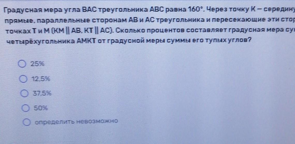 Градусная мера угла ВАС треугольника ABC равна 160. Через точку к– середину стороны ВС – проведены прямые. Параллельные сторонам AB и AC треугольника и пересекающие эти стороны соответственно в точках t и m(KM || AB, KT || АС). Сколько процентов составляет градусная мера суммы острых углов четырёхугольника AMKI от градусной меры суммы его тупых углов?